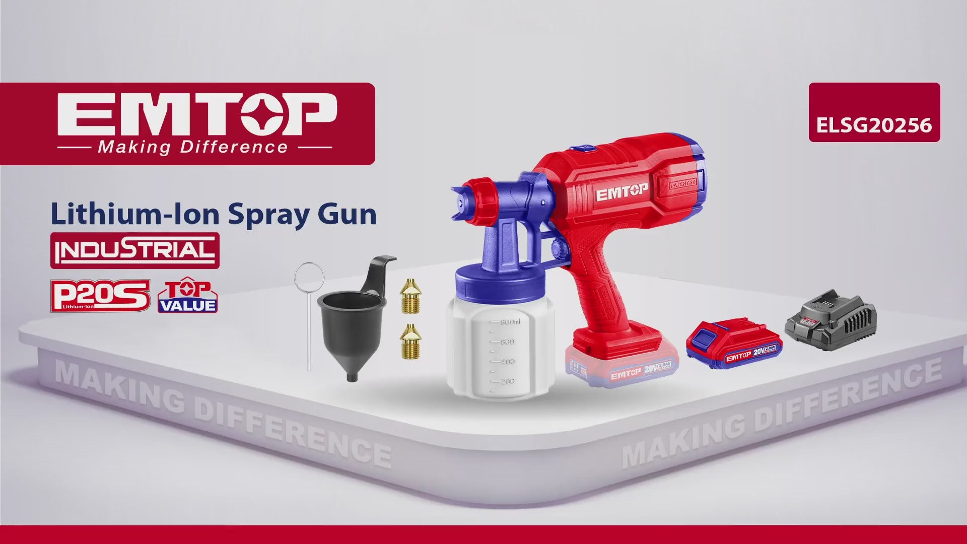 Pistolet à Peinture Sans Fil EMTOP 20V avec Batterie 2.0Ah + Chargeur, 800 ml/min, 0,1-0,2 bar, 800 ml, avec accessoires – Outil de peinture électroportatif pour usage professionnel ou domestique