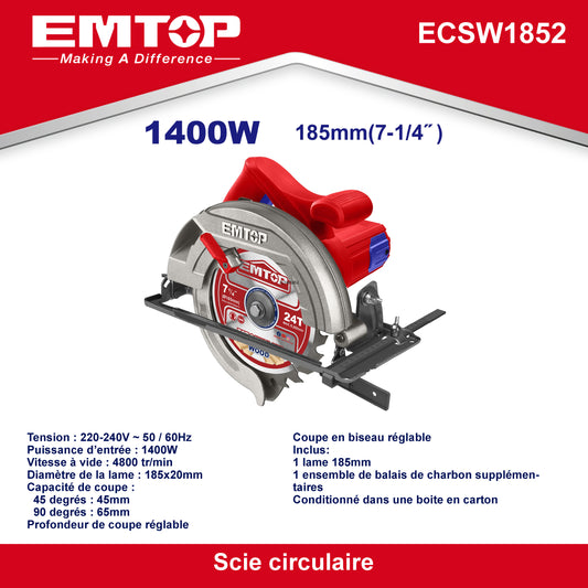 Produttore:E-Showroom MCPrezzo di listino €109,50 EURScie circulaire filaire 1400W EMTOP 185mm