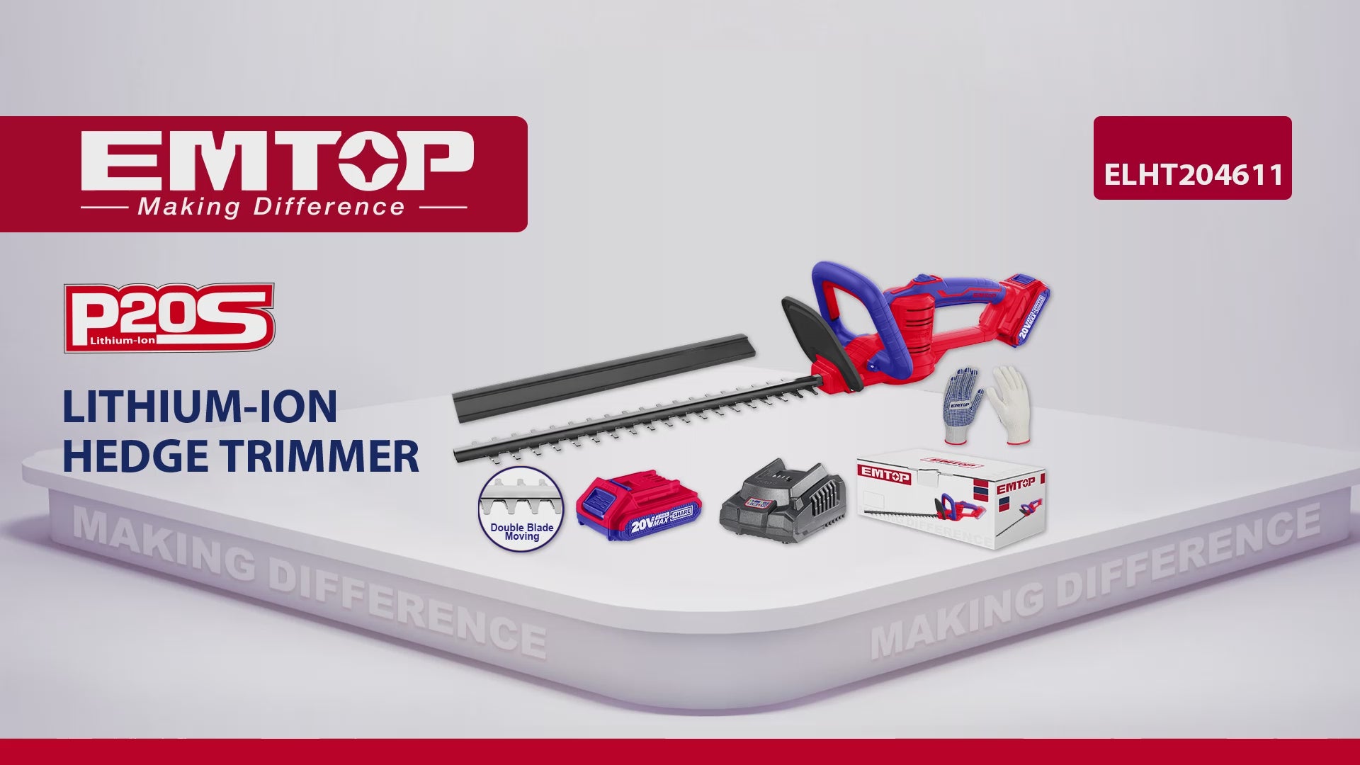 Taille-haie sur batterie EMTOP 20V avec 1 chargeur + 1 batterie lithium-ion 2.0Ah + Gant picots PVC Longueur de Lame 460 mm Diamètre de Coupe 16 mm, Taille-haie électrique sans fil, Outils de jardinage, Tailler les végétaux, Tailler, couper, élaguer, broyer